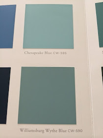 The paint on the back of the shelves is Wythe Blue by Benjamin Moore. When I shared the sample with them, they thought it might be a bit too dark for the space. So they decided on the color above Wythe Blue called Chesapeake Blue.